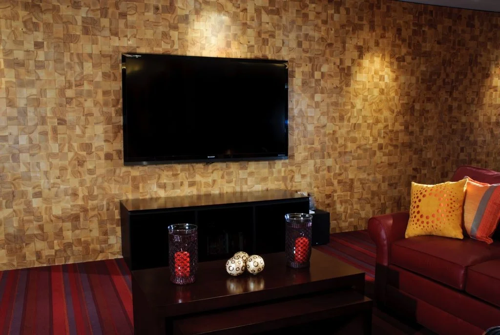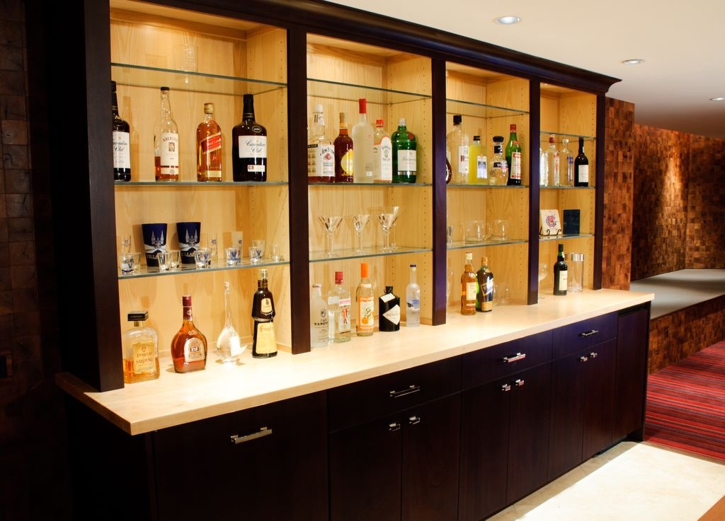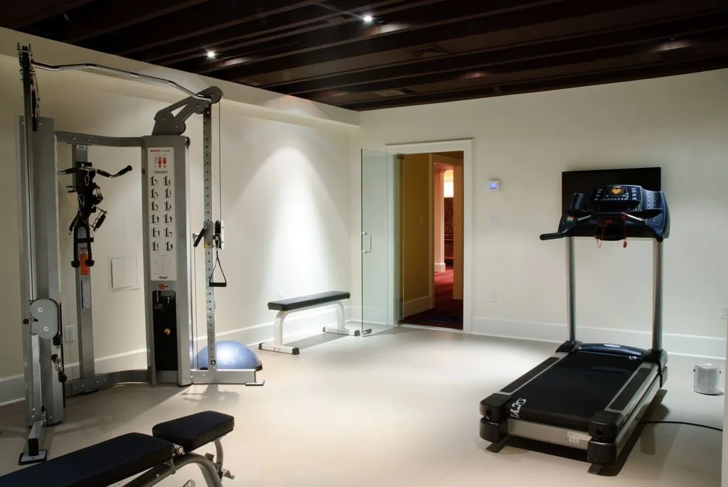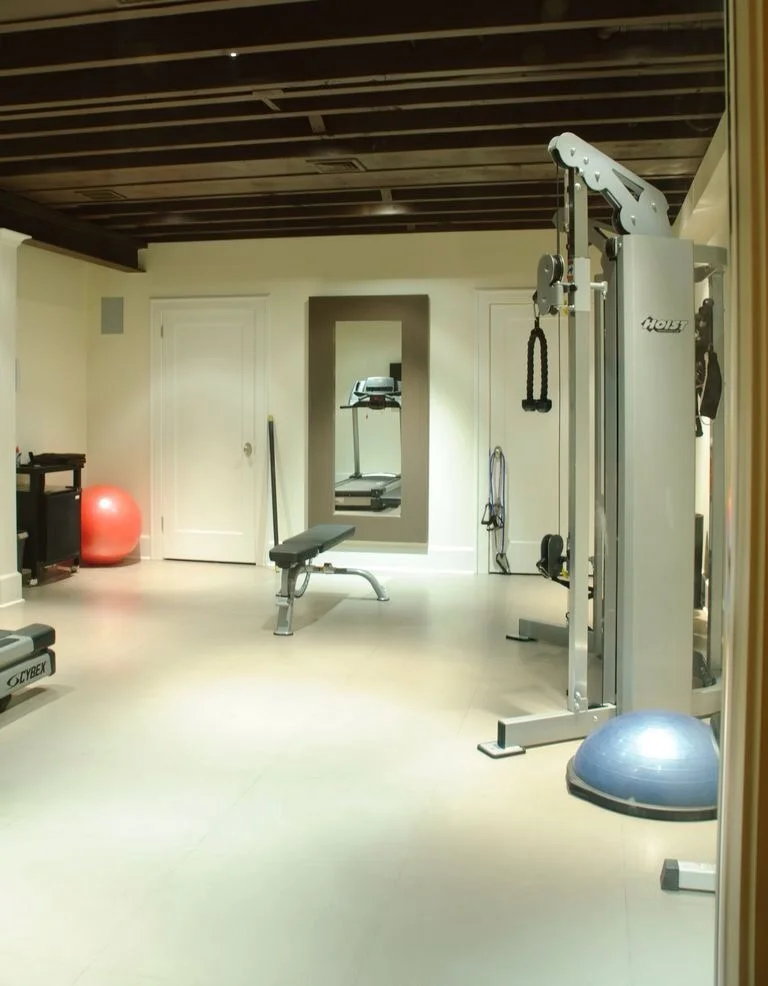 Finished basements add valuable living space to your home. These pictures show a TV watching area, a bar, a wine cellar with humidor & a home gym.
